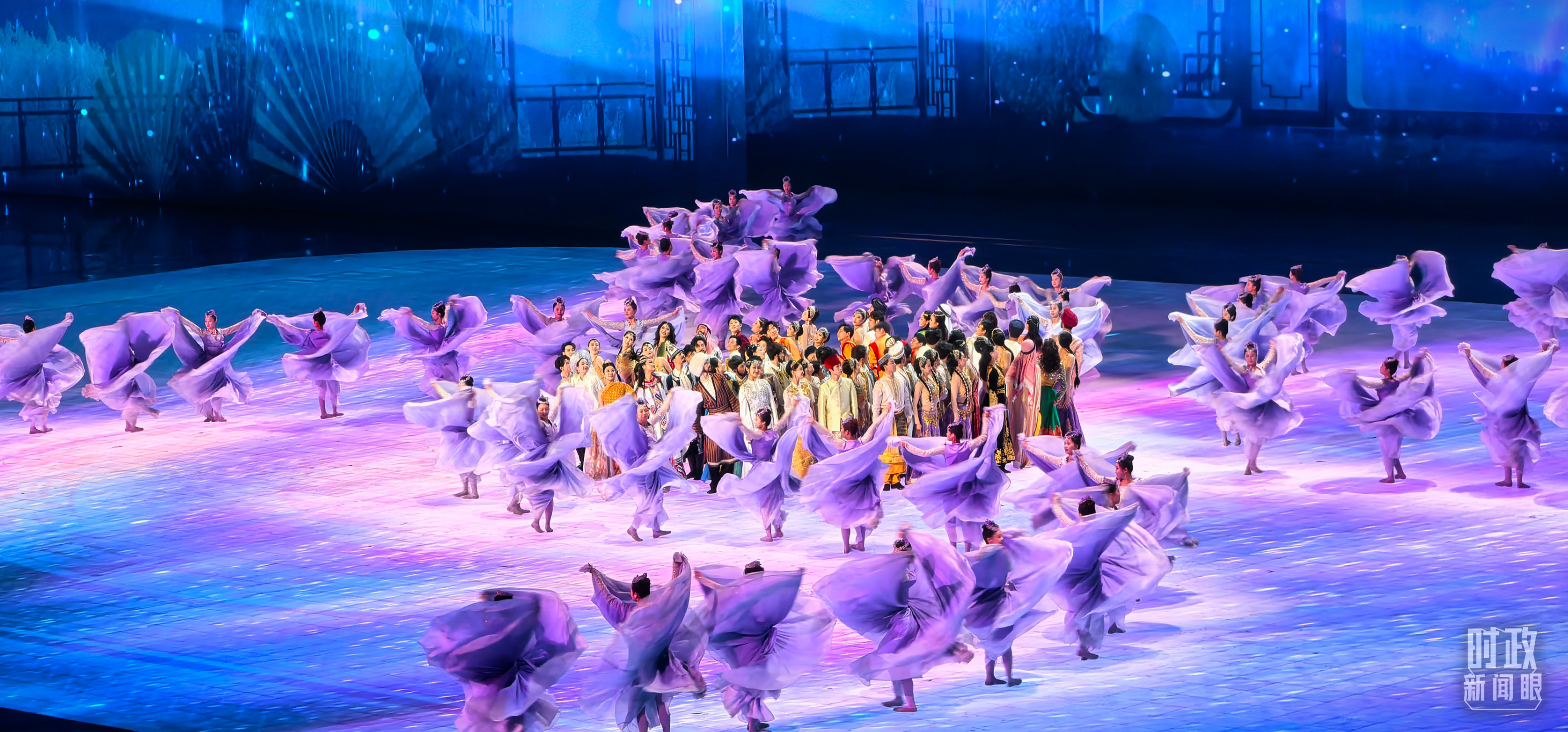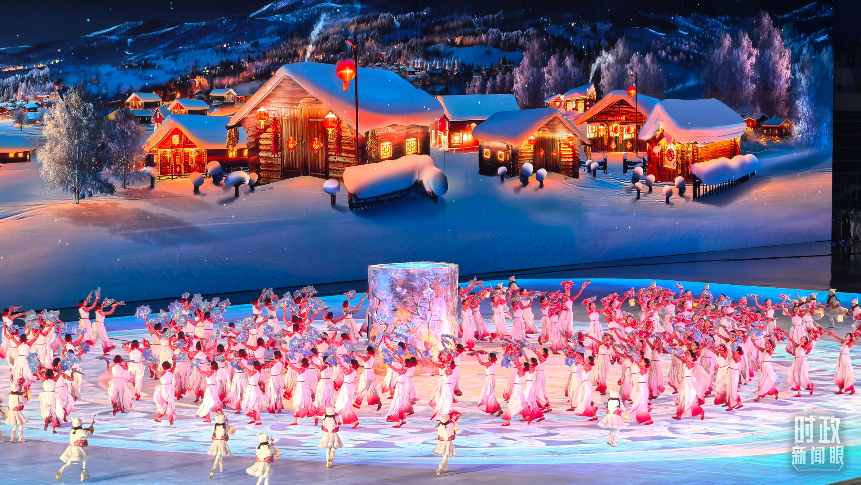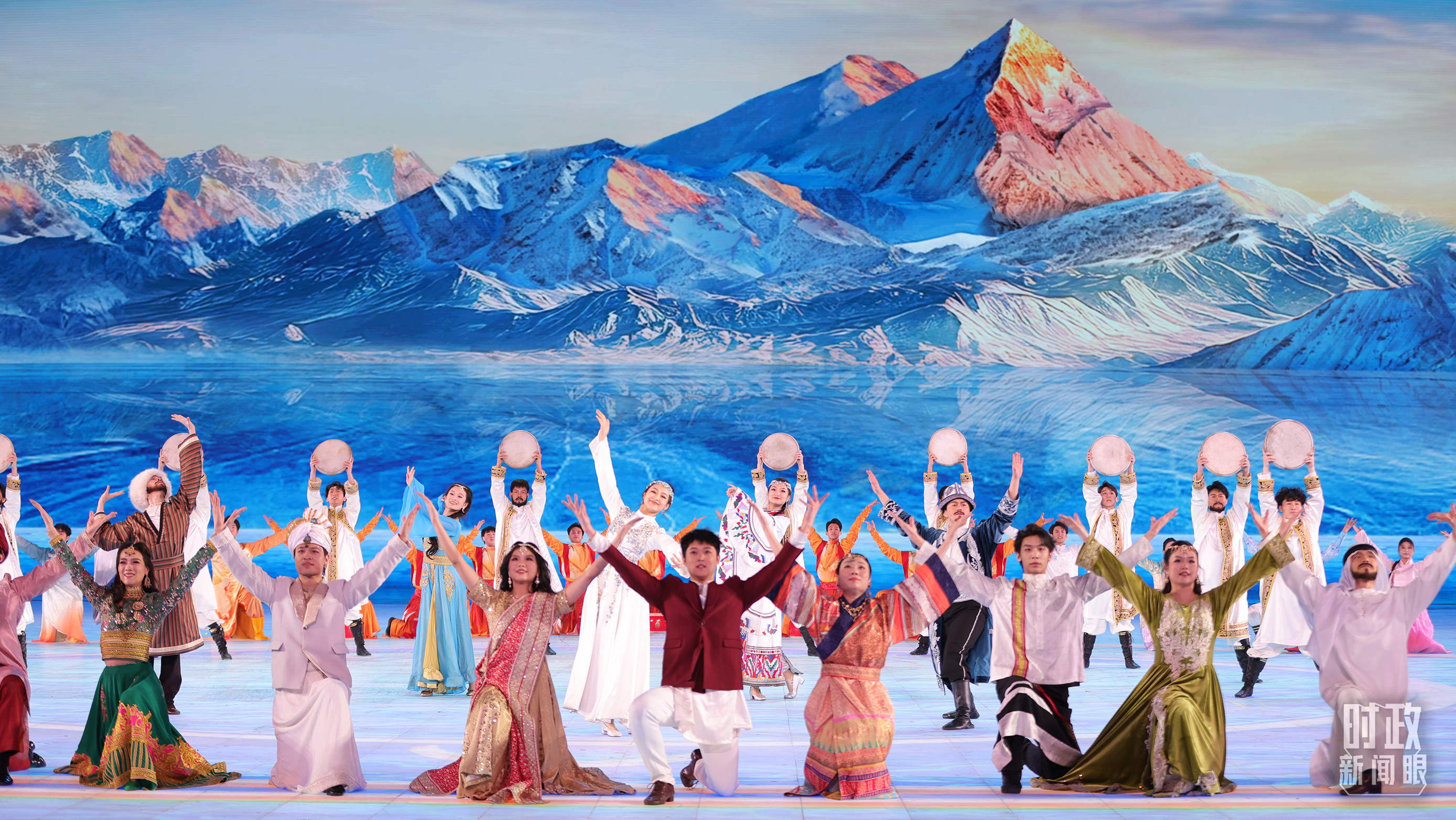 文藝表演分為上篇《熾熱冰雪》、中篇《燃情時(shí)速》、下篇《山高水長》,通過《長歌頌冰河》《榮光耀未來》《馳騁天地間》《璀璨嘉年華》《攜手情久長》《萬里共和鳴》等節(jié)目,展現(xiàn)化“極寒”為“極美”“極燃”“極暖”的意蘊(yùn)。