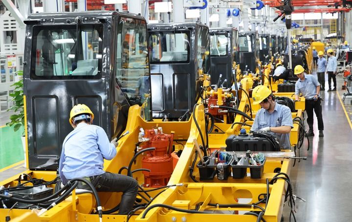 這是在廣西柳州市柳工挖掘機(jī)智慧工廠拍攝的挖掘機(jī)上部機(jī)構(gòu)件組裝線(2024年11月12日攝)。