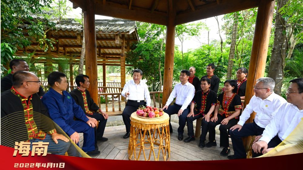 2022年4月,總書(shū)記來(lái)到海南五指山市水滿鄉(xiāng)毛納村考察調(diào)研。村寨涼亭里,鄉(xiāng)親們正議農(nóng)事。