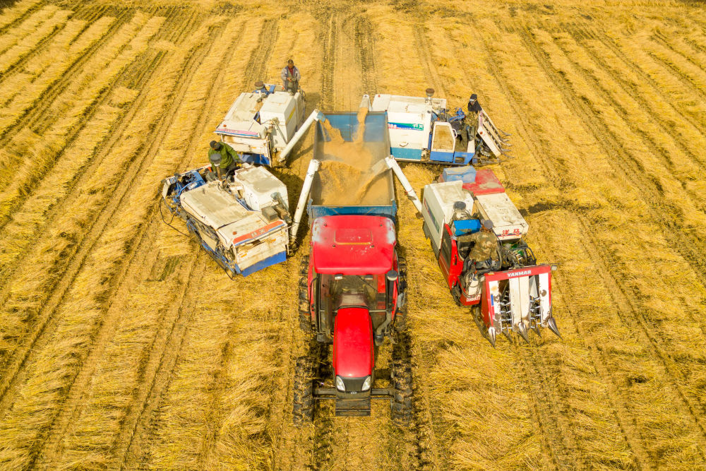 2024年10月13日,在黑龍江省綏化市北林區(qū)雙河鎮(zhèn),村民駕駛收割機(jī)進(jìn)行卸糧作業(yè)(無(wú)人機(jī)照片)。