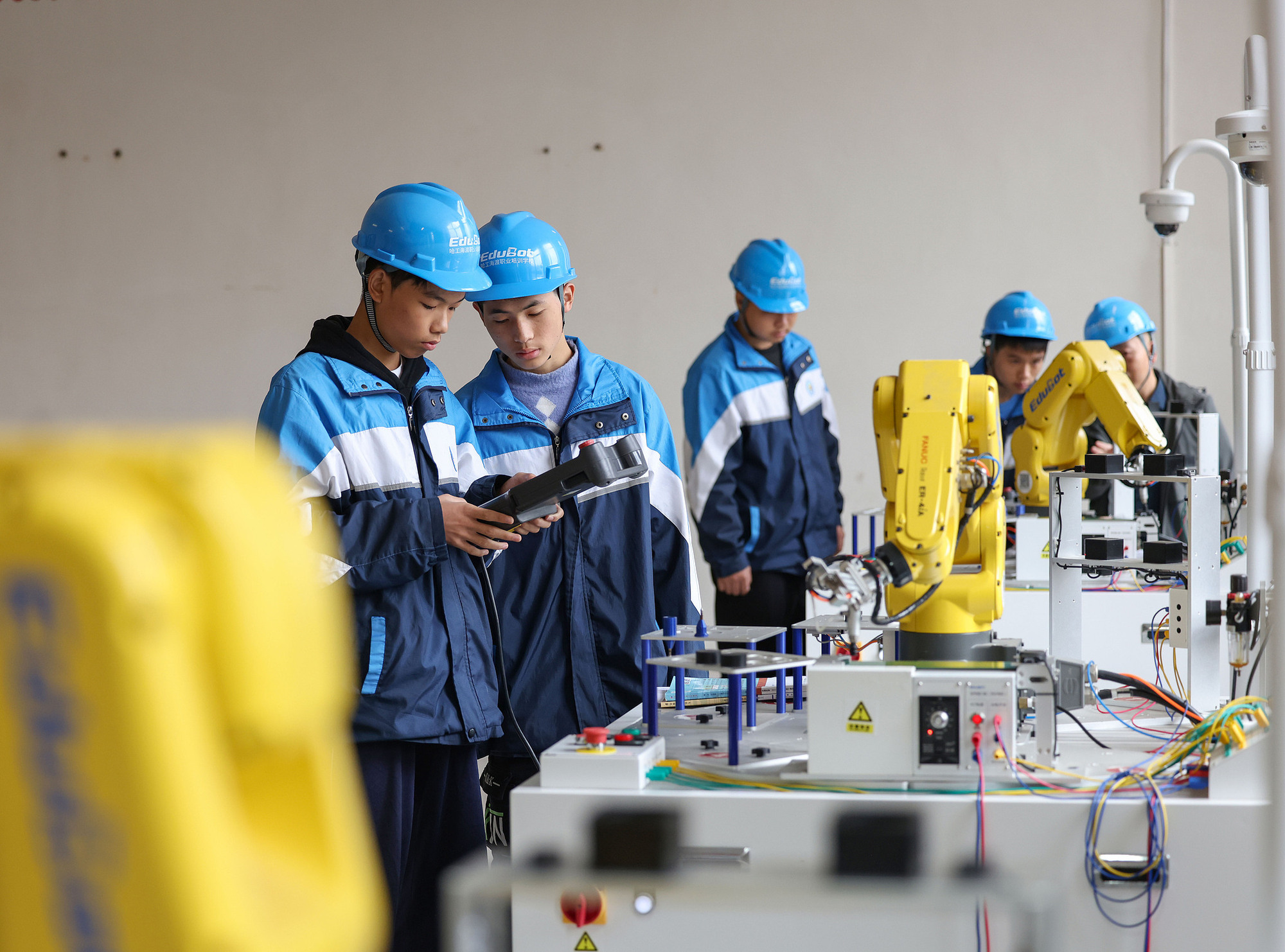 職業(yè)學校的學生在進行工業(yè)機器人實操