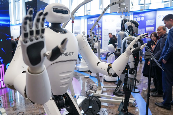 2025年2月14日在2025年蘇州市“人工智能+”創(chuàng)新發(fā)展推進大會暨人工智能賦能新型工業(yè)化深度行(蘇州站)活動現(xiàn)場拍攝的人形機器人。新華社記者 李博 攝