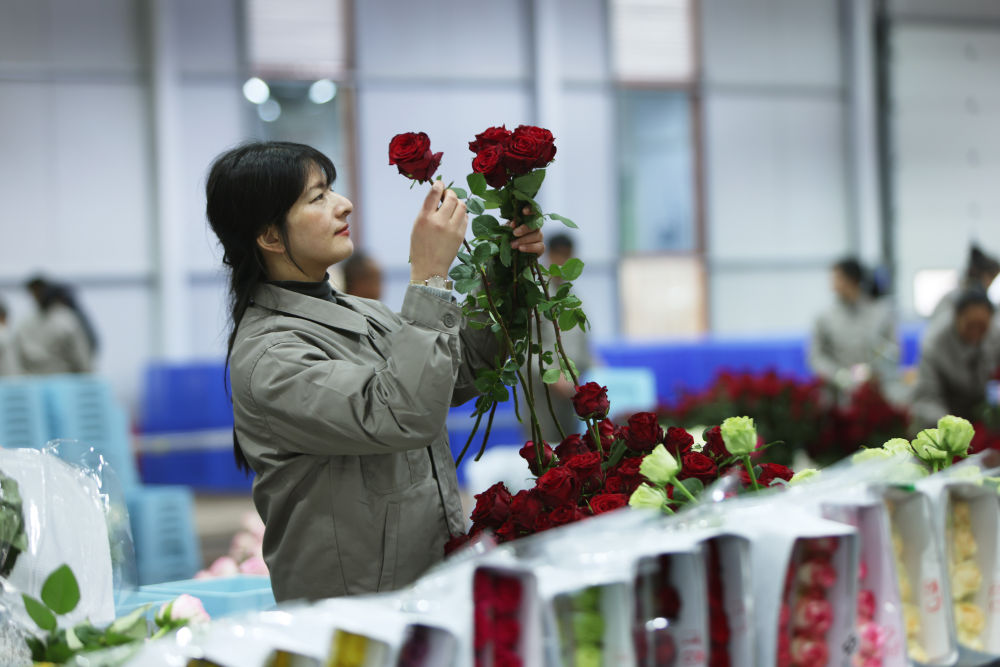 2017年2月14日,消費(fèi)者在云南省昆明市斗南花卉市場(chǎng)選購(gòu)玫瑰花。