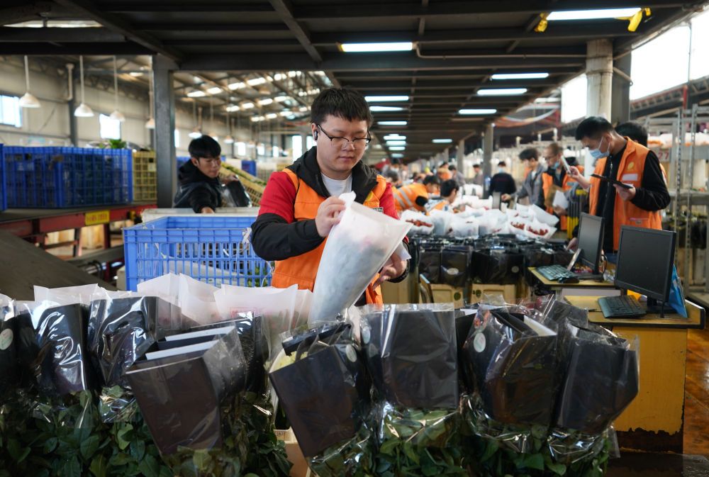 2022年11月11日,工作人員在昆明斗南花市給鮮花貼標(biāo)簽??爝f物流時(shí)效不斷優(yōu)化、冷鏈運(yùn)輸技術(shù)持續(xù)提升,也為中國(guó)鮮花加速“出?!北q{護(hù)航。