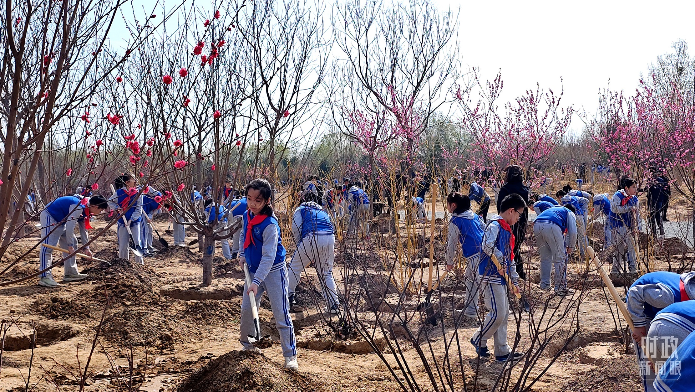 △少先隊(duì)員拿起鐵鍬參加義務(wù)植樹。(總臺(tái)央視記者范凱拍攝)
