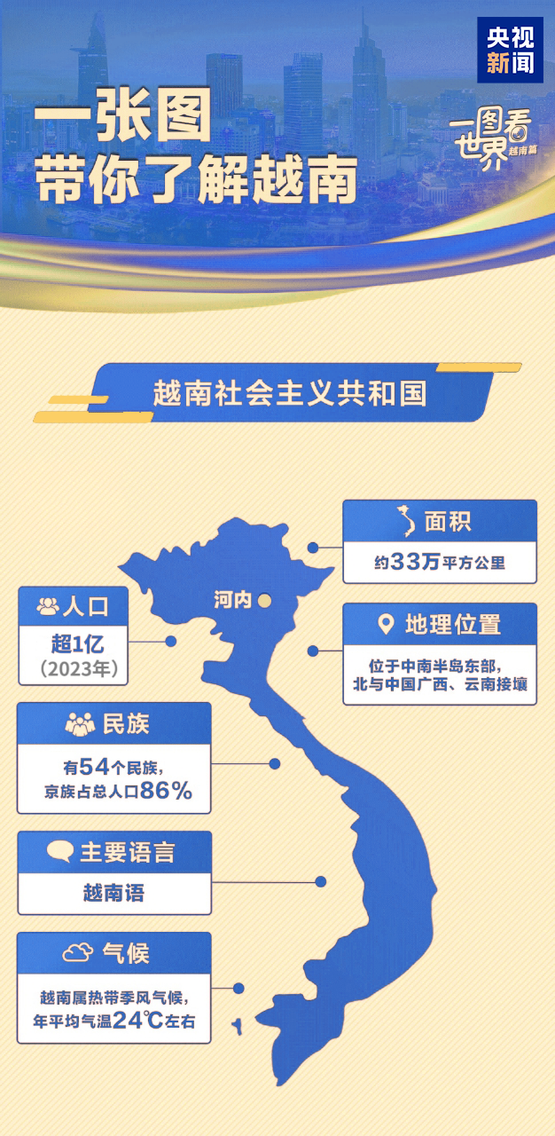 這里與華夏大地山水相依,兩國人民“共飲一江水,早相見、晚相望”。75載悠悠歲月里,中越情誼早已超越地理上的毗鄰,成為常來常往的好鄰居、好朋友、好同志、好伙伴。讓我們跟隨習(xí)主席的步伐,去這個親如手足的鄰居家串個門。