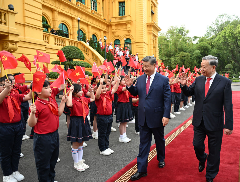 越共中央總書記蘇林為對(duì)越南進(jìn)行國(guó)事訪問的中共中央總書記、國(guó)家主席習(xí)近平舉行隆重歡迎儀式,兩位領(lǐng)導(dǎo)人在紅毯上并肩前行。