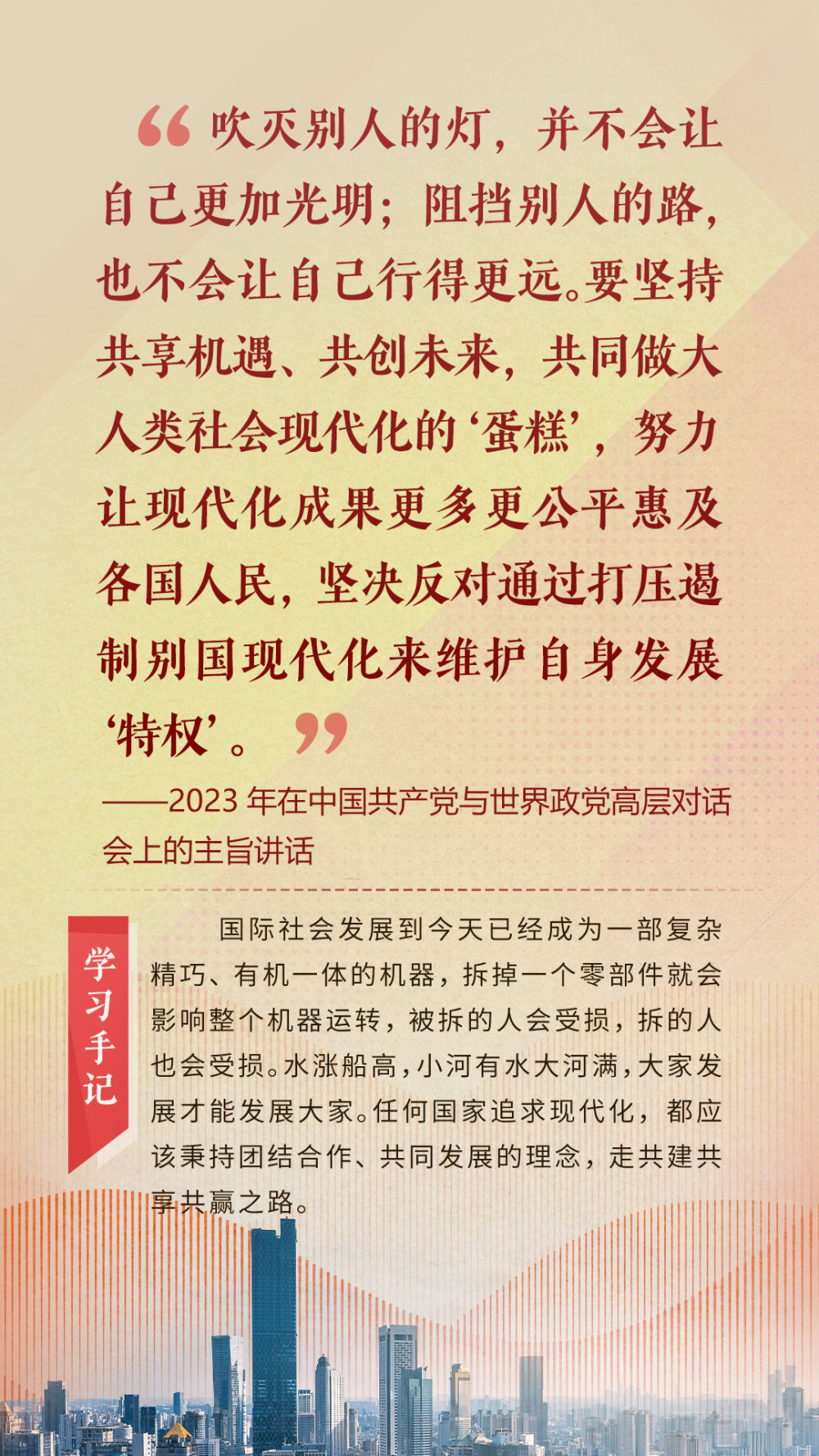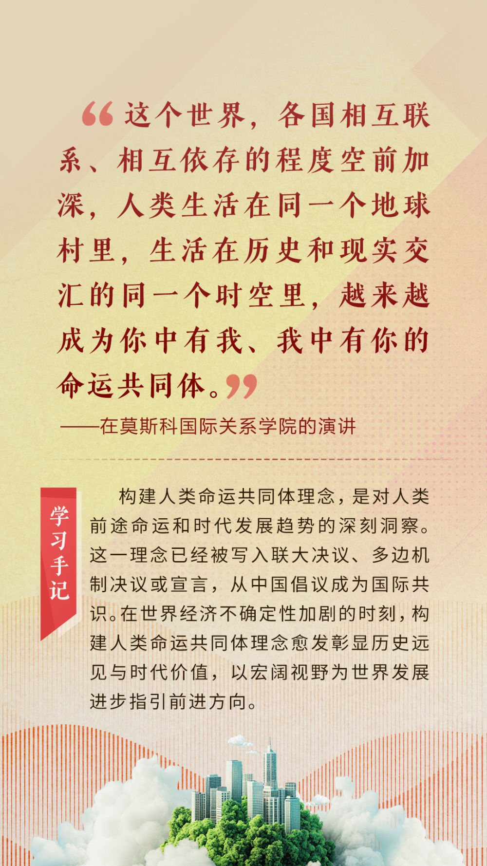 “天空足夠大,地球足夠大,世界也足夠大,容得下各國(guó)共同發(fā)展繁榮”“你中有我、我中有你的命運(yùn)共同體”“與中國(guó)同行就是與機(jī)遇同行”……習(xí)近平總書(shū)記一次次在重要場(chǎng)合發(fā)表重要講話,指引我們站在歷史正確的一邊,站在人類進(jìn)步的一邊,不畏浮云、登高望遠(yuǎn),不懼風(fēng)浪、勇毅前行。