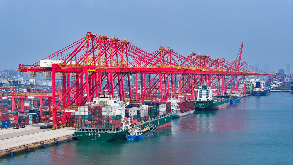 輪船在山東港口日照港集裝箱碼頭停泊作業(yè)(無人機(jī)照片,2024年8月22日攝)。新華社記者 李紫恒 攝