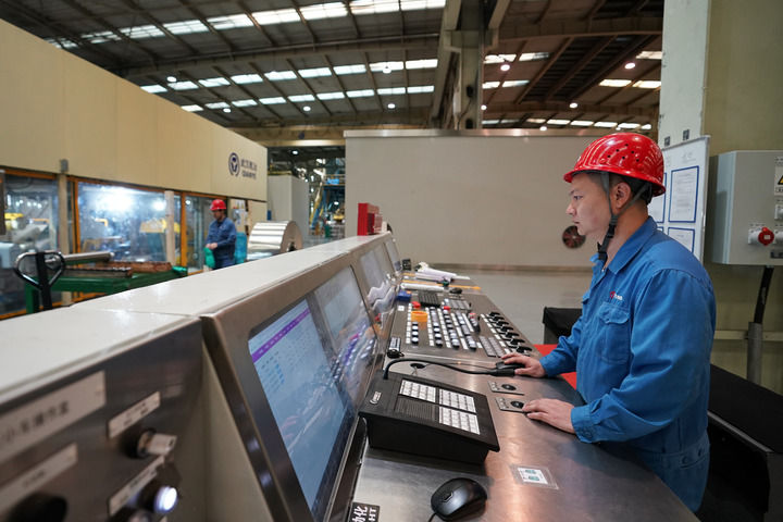 工作人員在太鋼不銹鋼精密帶鋼有限公司車間作業(yè)(2023年10月24日攝)。新華社記者 詹彥 攝