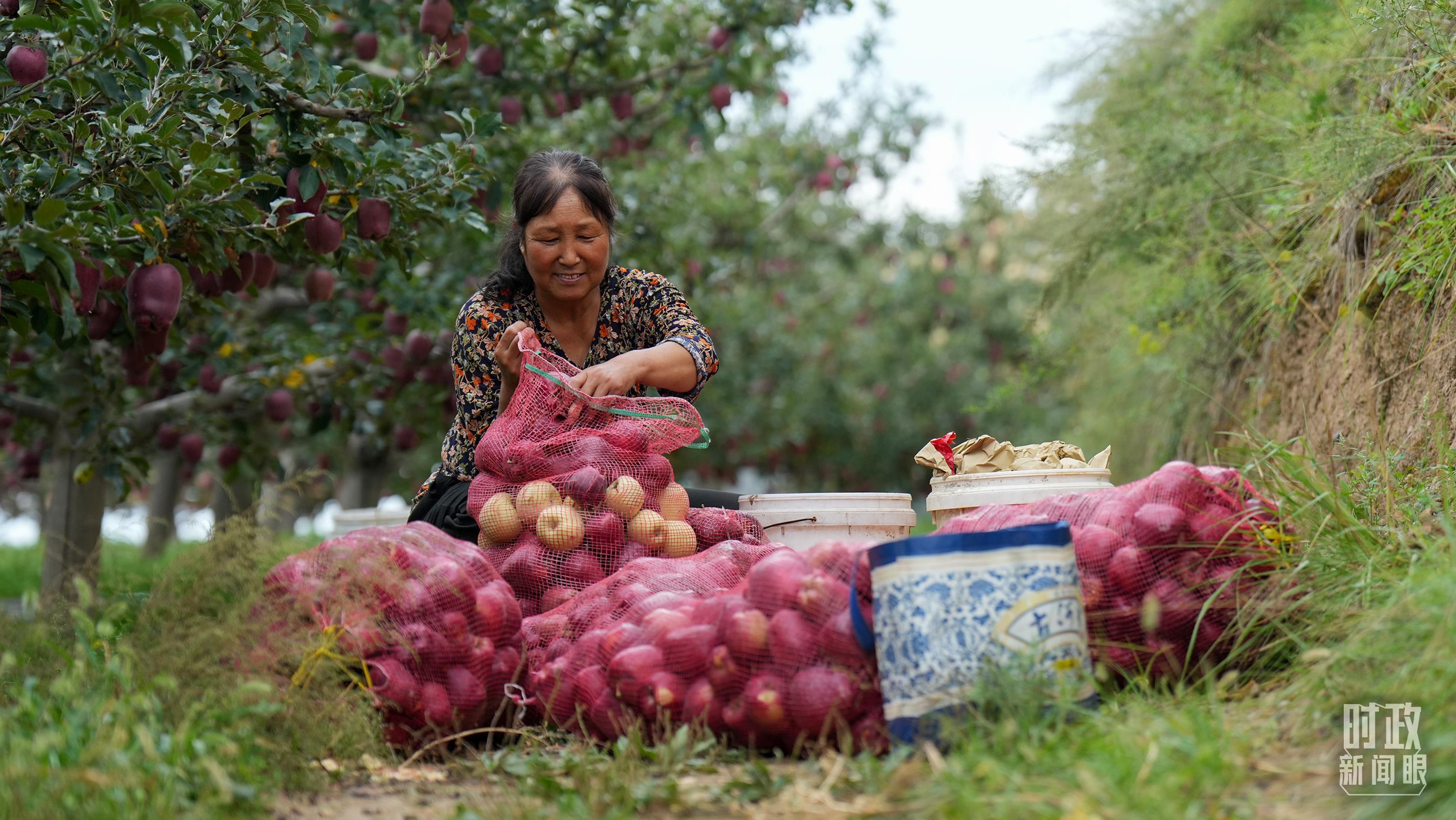 △甘肅天水市南山花牛蘋果基地帶動當(dāng)?shù)卮迕駥崿F(xiàn)增收。(總臺記者李晉拍攝)
