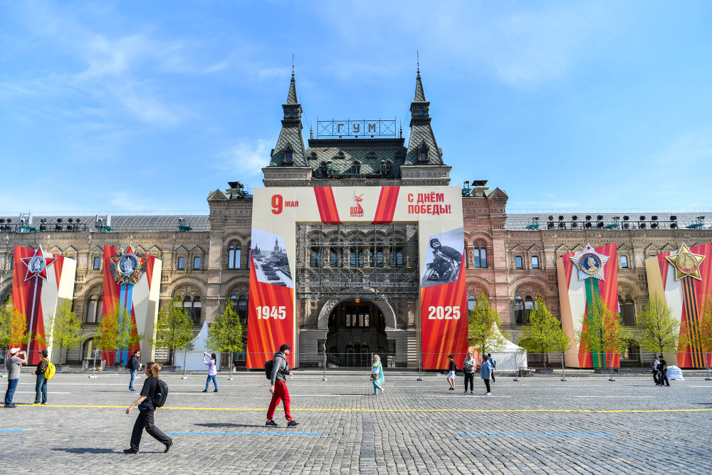 紀(jì)念蘇聯(lián)偉大衛(wèi)國(guó)戰(zhàn)爭(zhēng)勝利80周年慶典前夕,莫斯科街頭,寫(xiě)有“勝利”字樣的旗幟隨風(fēng)飄揚(yáng)。在路邊,以蘇聯(lián)衛(wèi)國(guó)戰(zhàn)爭(zhēng)歷史為主題的圖片展板和裝飾櫥窗吸引行人停下腳步,或合影留念,或?yàn)g覽沉思。