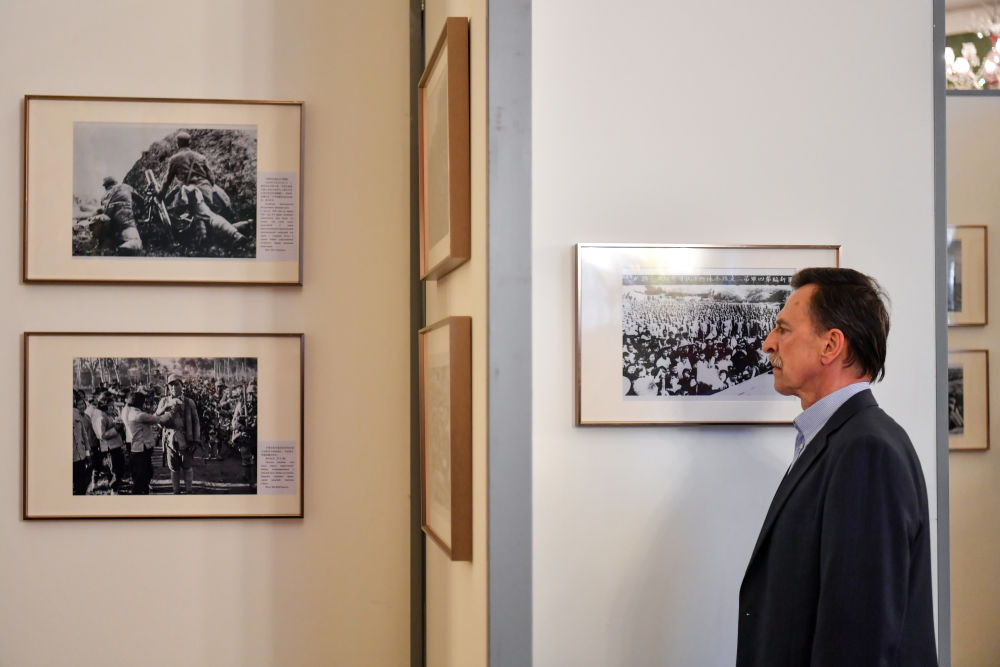 4月18日,在俄羅斯首都莫斯科,嘉賓參觀紀(jì)念中國(guó)人民抗日戰(zhàn)爭(zhēng)暨世界反法西斯戰(zhàn)爭(zhēng)勝利80周年圖片展。新華社記者 曹陽(yáng) 攝