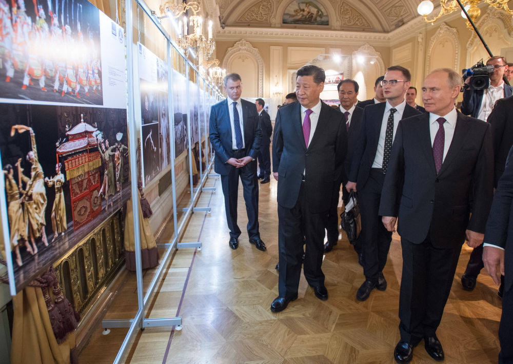 2019年6月5日,國家主席習(xí)近平和俄羅斯總統(tǒng)普京在莫斯科大劇院共同出席中俄建交70周年紀(jì)念活動。這是兩國元首共同參觀中俄建交70周年圖片展。