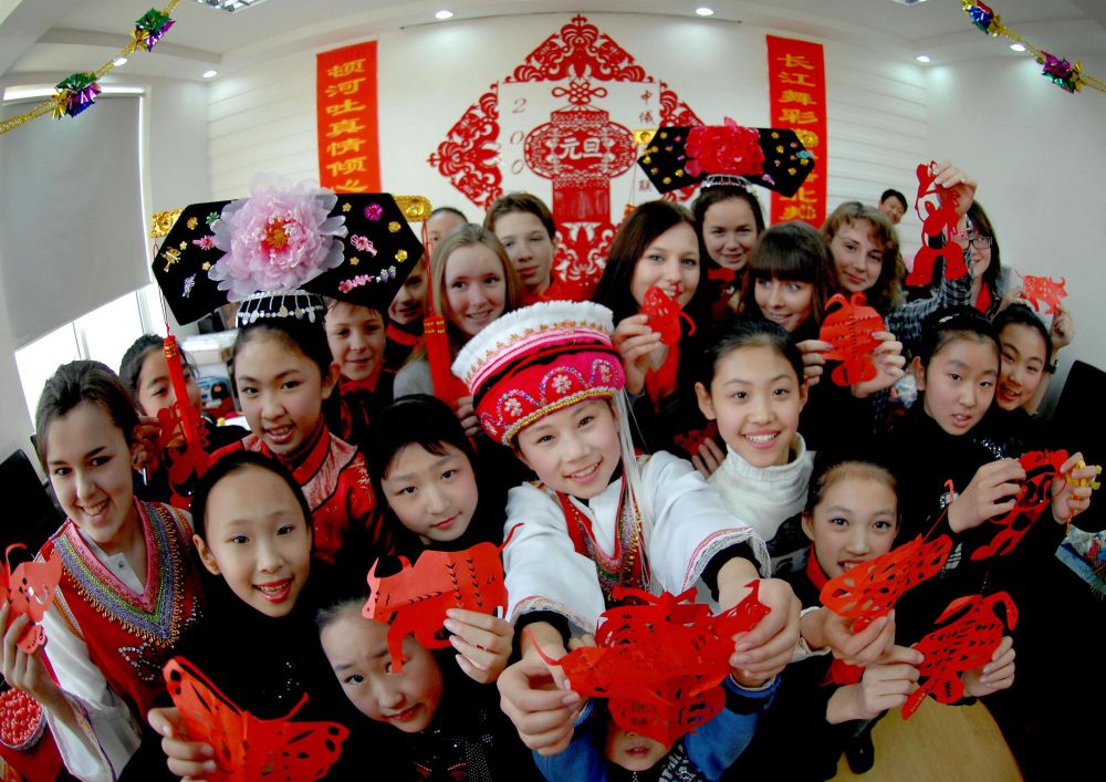 2008年12月30日,中俄學(xué)生在沈陽“莫斯科學(xué)生體驗(yàn)中國冬令營”活動上展示自己的剪紙作品。