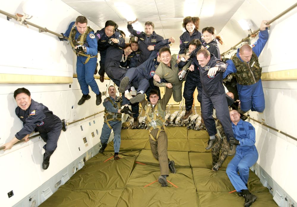 2004年12月17日,在俄羅斯首都莫斯科的加加林阿特拉斯宇航中心,10名中國游客在俄羅斯宇航員的保護(hù)下體驗(yàn)太空失重訓(xùn)練。