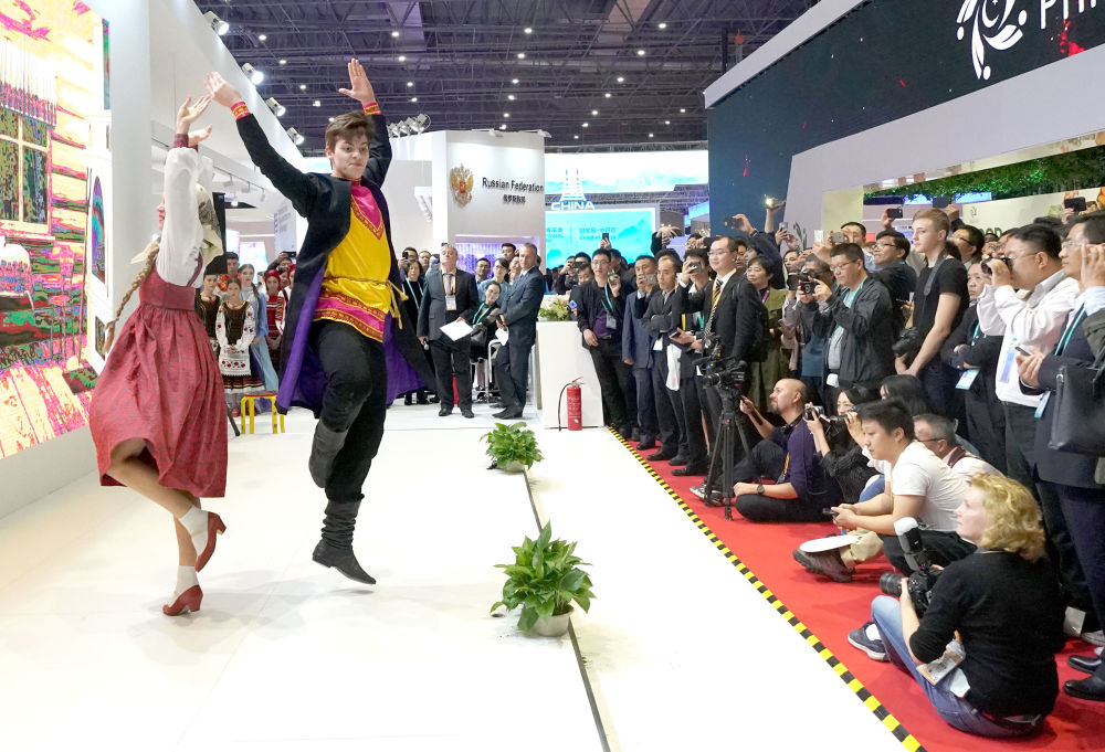 2018年11月6日,俄羅斯演員在上海舉行的首屆中國國際進(jìn)口博覽會俄羅斯展區(qū)表演舞蹈。
