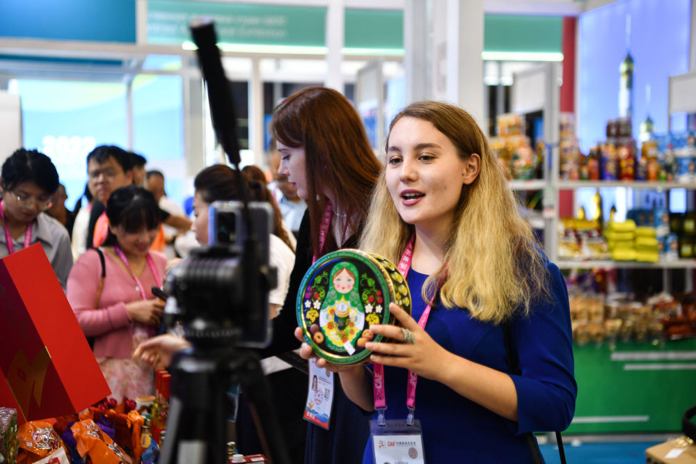 2023年9月19日,來自俄羅斯的參展商在陜西楊凌農(nóng)高會展臺進(jìn)行直播。