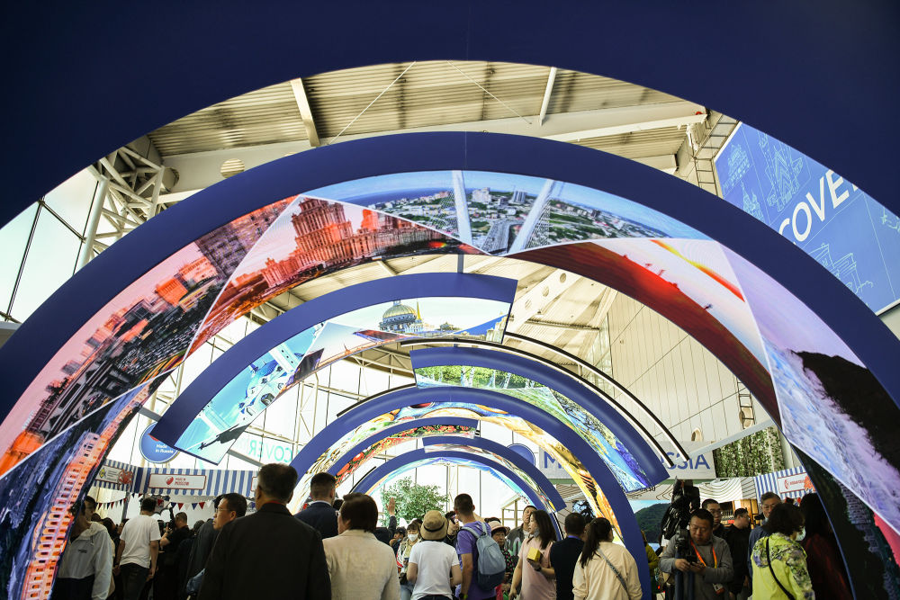 2024年5月18日,人們走進(jìn)在哈爾濱國際會展中心舉行的第八屆中俄博覽會展館。