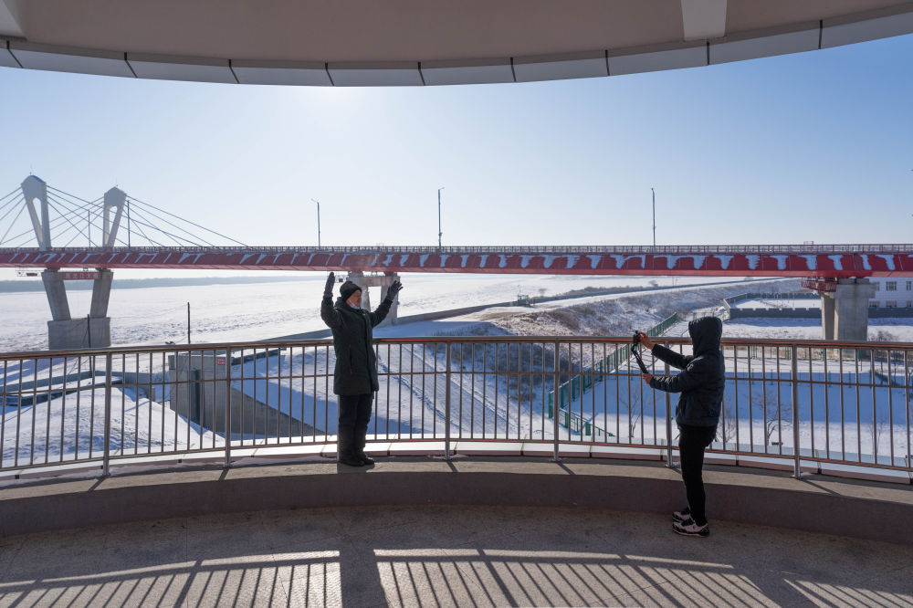 2024年1月30日,游客在黑龍江省黑河市黑龍江大橋公園內(nèi)的觀光塔上留影。黑河—布拉戈維申斯克黑龍江大橋于2022年6月10日正式通車,是中俄首座跨黑龍江(俄羅斯稱阿穆爾河)界河公路橋,在中國東北地區(qū)和俄羅斯遠(yuǎn)東地區(qū)之間開辟了新的國際運(yùn)輸通道。