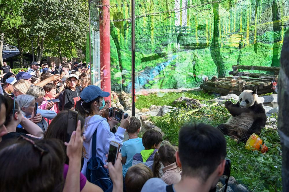 2024年7月31日,觀眾在俄羅斯莫斯科動物園拍攝大熊貓“如意”。當(dāng)日,莫斯科動物園為來自中國的大熊貓“如意”慶祝生日。雄性大熊貓“如意”2016年7月31日出生于中國四川雅安碧峰峽基地,它和大熊貓“丁丁”于2019年4月29日抵達(dá)莫斯科,開啟為期15年的旅居生活。