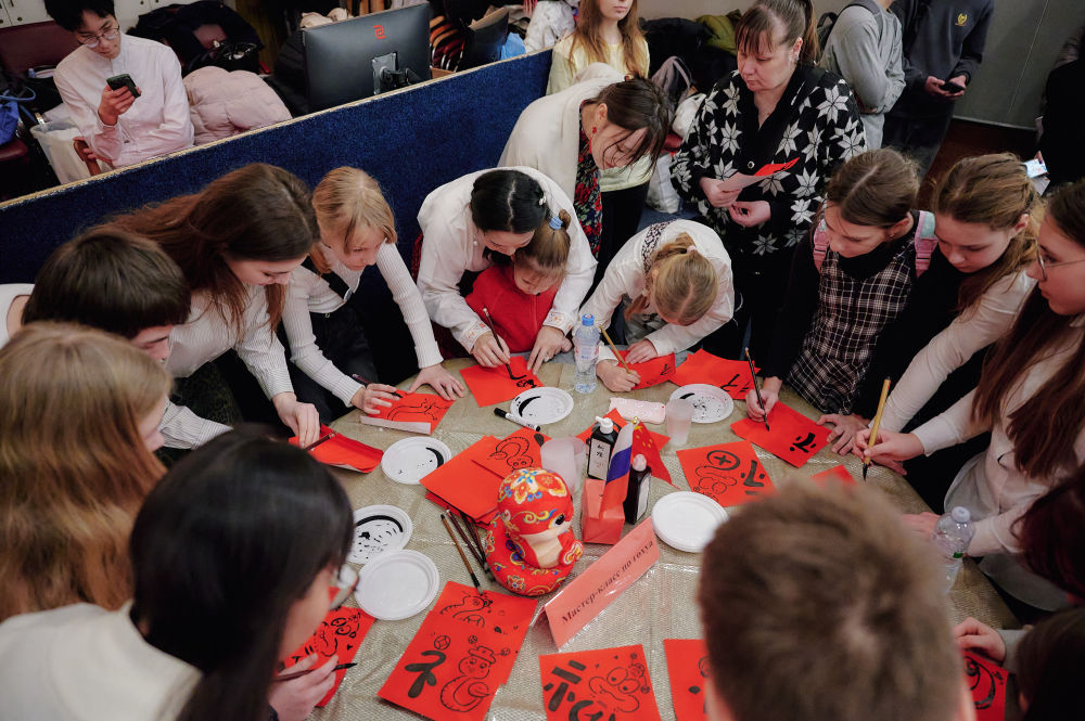 2025年2月3日,俄羅斯圣彼得堡學(xué)生在中小學(xué)春節(jié)聯(lián)歡節(jié)上體驗(yàn)中國書法。