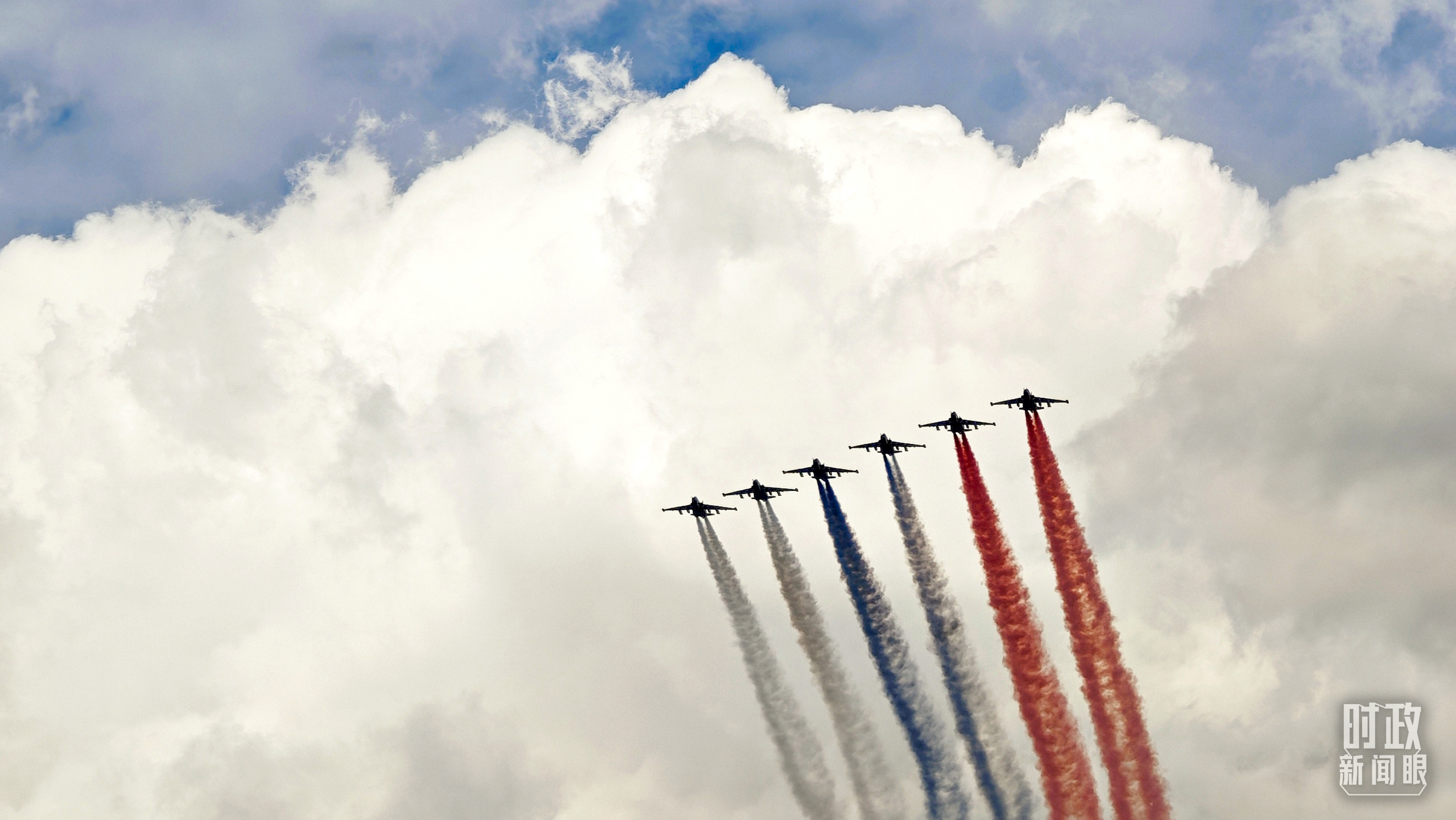 5月7日,參加紀(jì)念蘇聯(lián)偉大衛(wèi)國(guó)戰(zhàn)爭(zhēng)勝利80周年慶典彩排的空中飛行梯隊(duì)飛越紅場(chǎng)。(總臺(tái)央視記者王哈男拍攝)