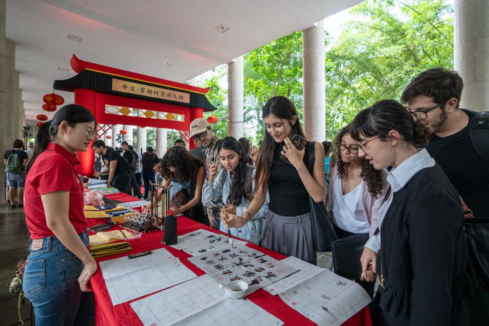2025年4月,在巴西里約熱內(nèi)盧天主教大學舉辦的“國際中文日”慶祝活動上,學生們體驗中文書法。