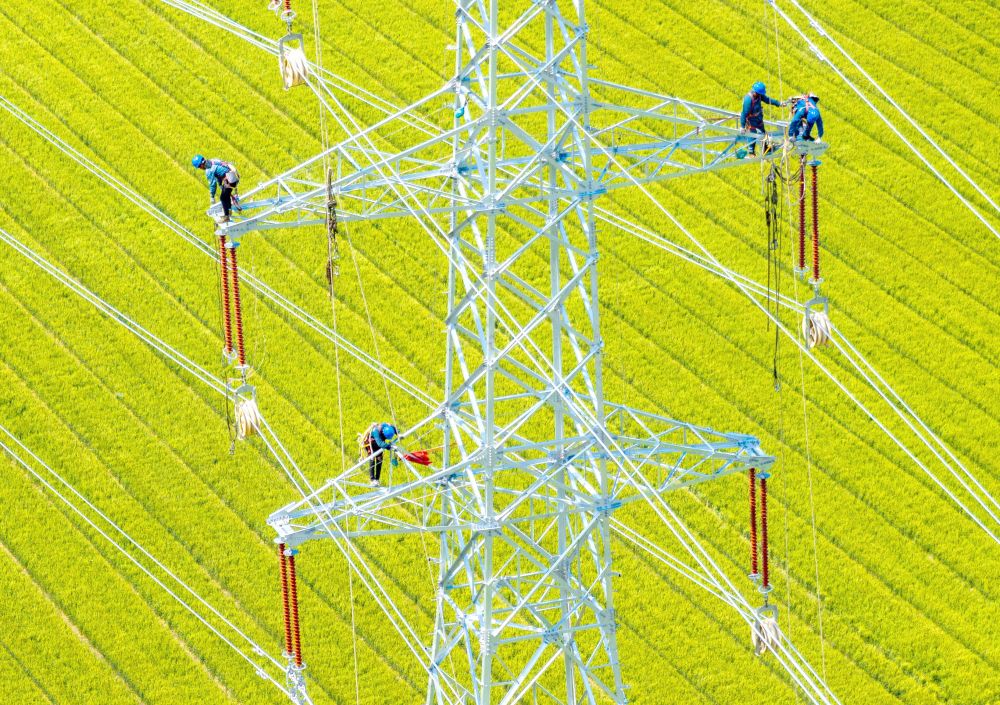 2025年5月4日,電力施工人員在江蘇省揚州市江都區(qū)武堅鎮(zhèn)至江蘇省興化經濟開發(fā)區(qū)的220千伏華電武堅25萬千瓦集中式光伏項目配套輸電線路上作業(yè)(無人機照片)。新華社發(fā)(任飛攝)