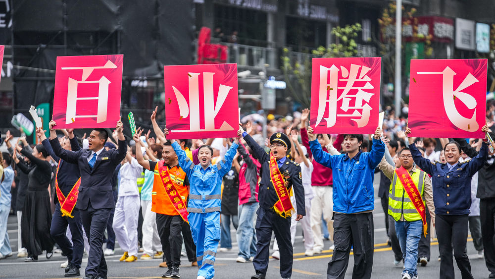 2025年5月18日,貴州民族團結大巡游活動在貴州省貴陽市舉行。這是奮斗之光方陣的表演隊伍在進行巡游。新華社記者 陶亮 攝