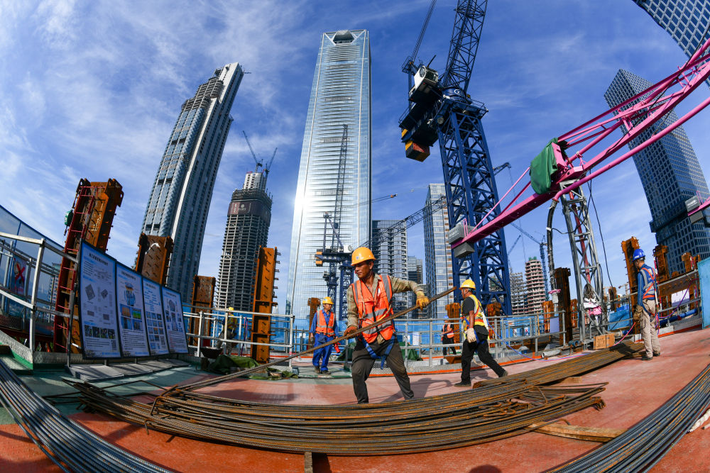 2024年10月3日,中建五局的建設者在深圳灣超級總部基地C塔項目建設現場施工。新華社記者 梁旭 攝