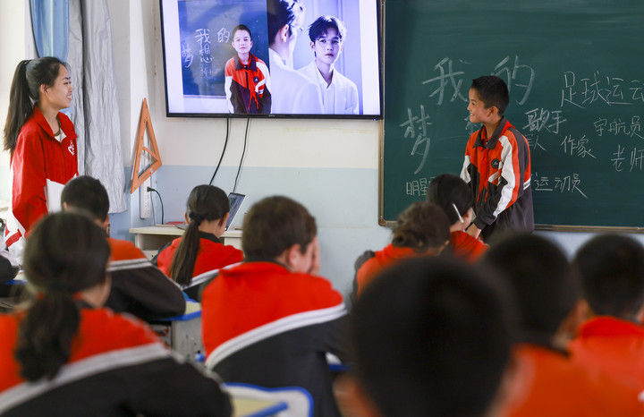 新疆克孜勒蘇柯爾克孜自治州阿圖什市哈拉峻鄉(xiāng)謝依特小學(xué),是一所主要面向柯爾克孜族學(xué)生的村級小學(xué),2022年8月成為該州首個(gè)西部計(jì)劃志愿者包校支教的試點(diǎn)學(xué)校。23名戍邊支教西部計(jì)劃志愿者服務(wù)隊(duì)的志愿者,在這所小學(xué)承擔(dān)著教書育人的工作。經(jīng)過近三年的支教服務(wù),學(xué)生的學(xué)習(xí)成績顯著提高,得到當(dāng)?shù)貜V泛認(rèn)可。這是2025年4月23日,支教教師高淑賢(左一)在班級里展示她為學(xué)生們制作的“AI夢想職業(yè)照”。