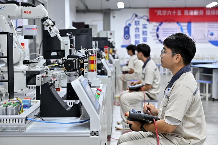 2024年7月26日,湖南鐵道職業(yè)技術(shù)學(xué)院的學(xué)生在工業(yè)機(jī)器人基礎(chǔ)應(yīng)用實(shí)訓(xùn)室接受工業(yè)機(jī)器人操控技能訓(xùn)練。教育部發(fā)布的數(shù)據(jù)顯示,近年來,現(xiàn)代制造業(yè)、戰(zhàn)略性新興產(chǎn)業(yè)和現(xiàn)代服務(wù)業(yè)70%以上的新增一線從業(yè)人員來自職業(yè)院校。職業(yè)院校已經(jīng)成為培養(yǎng)大國工匠、能工巧匠、高技能人才的主陣地。