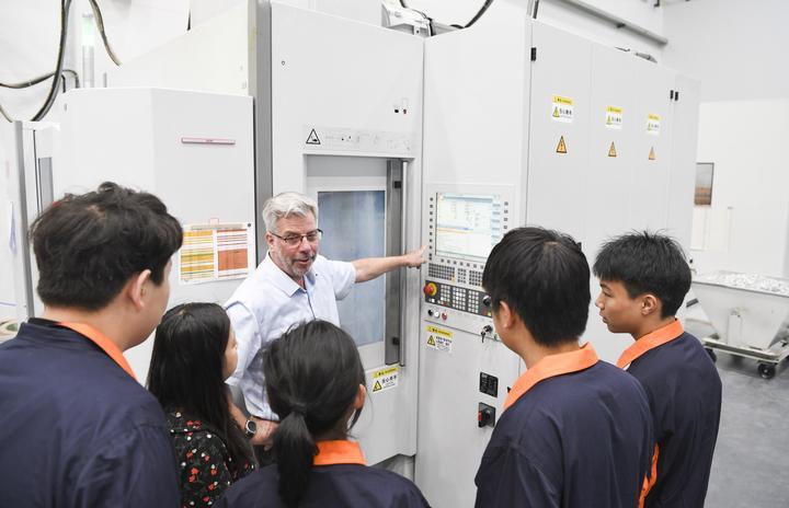 2024年4月16日,在位于重慶市永川區(qū)中德產(chǎn)業(yè)園的埃斯維(重慶)機(jī)床有限公司,公司技術(shù)總監(jiān)向重慶城市職業(yè)學(xué)院中德產(chǎn)業(yè)學(xué)院學(xué)生介紹設(shè)備操作規(guī)范。近年來,重慶城市職業(yè)學(xué)院聯(lián)合德國教育力量共建產(chǎn)業(yè)學(xué)院,引入職業(yè)教育先進(jìn)經(jīng)驗(yàn),著力培養(yǎng)適合制造型企業(yè)需求的高素質(zhì)技能技術(shù)人才。