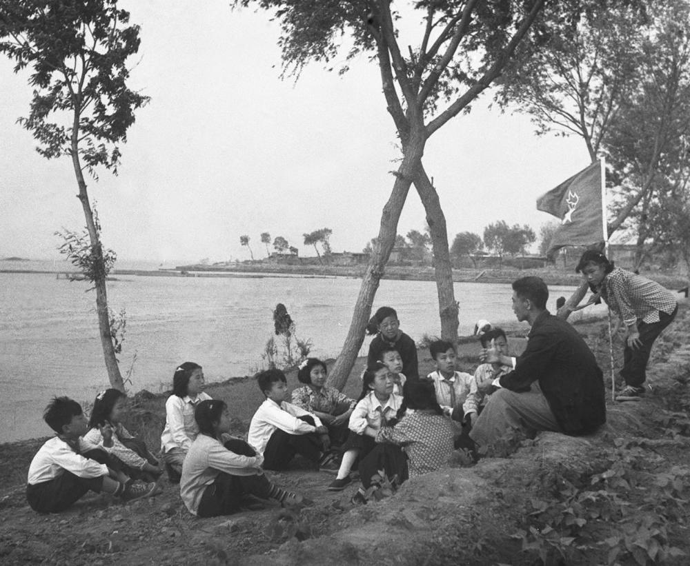 1955年,在河北白洋淀,新安小學(xué)的少先隊(duì)員們聽曾擔(dān)任過抗戰(zhàn)時(shí)期兒童團(tuán)團(tuán)長(zhǎng)的陳殿元講抗戰(zhàn)故事。