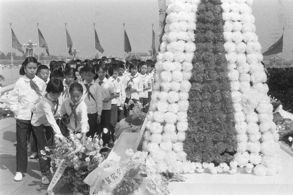 1985年,首都各界代表在天安門廣場(chǎng)人民英雄紀(jì)念碑前舉行獻(xiàn)花圈儀式,追念在抗日戰(zhàn)爭(zhēng)中犧牲的將士和死難同胞。這是海淀區(qū)少先隊(duì)員在敬獻(xiàn)花圈。