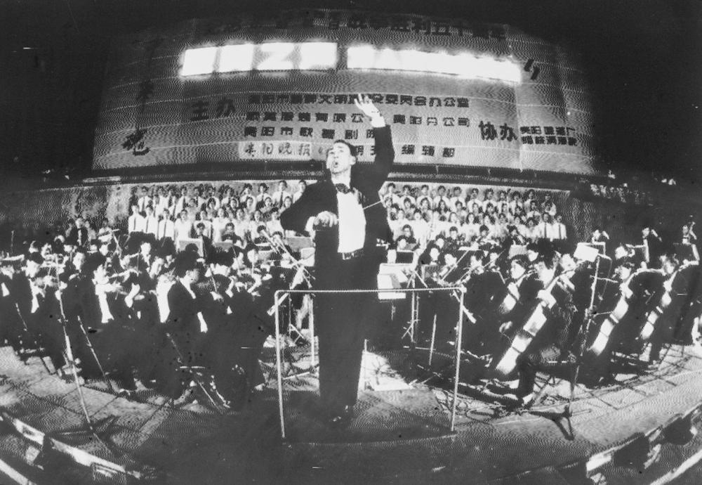 1995年8月15日,在貴陽市人民廣場(chǎng)舉行的萬人露天交響音樂會(huì)上,演員和萬余名市民高唱《義勇軍進(jìn)行曲》。