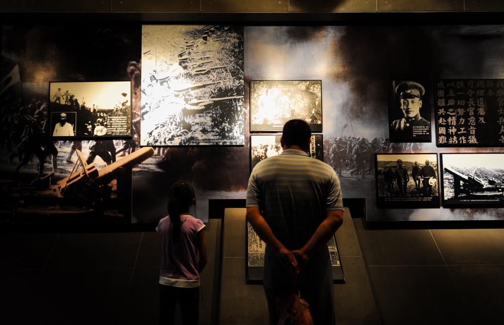 2013年8月15日,吉林省長(zhǎng)春市各界人士來到位于偽滿皇宮博物院內(nèi)的東北淪陷史紀(jì)念館,參觀日本侵略中國(guó)東北史實(shí)展覽,緬懷抗戰(zhàn)英烈。這是一對(duì)父女在參觀展覽。