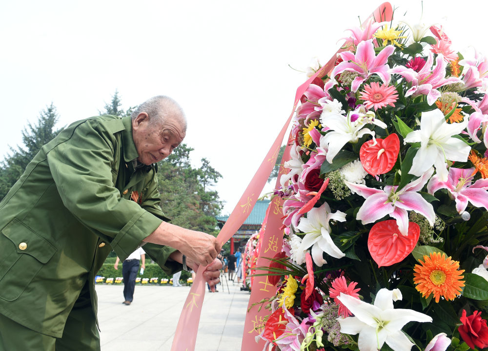 2015年8月15日,吉林省紀(jì)念東北抗聯(lián)精神大會(huì)在吉林通化舉行,各界群眾來到通化市楊靖宇烈士陵園,緬懷犧牲的東北抗聯(lián)將士。這是一位東北抗聯(lián)老戰(zhàn)士為烈士敬獻(xiàn)花圈。