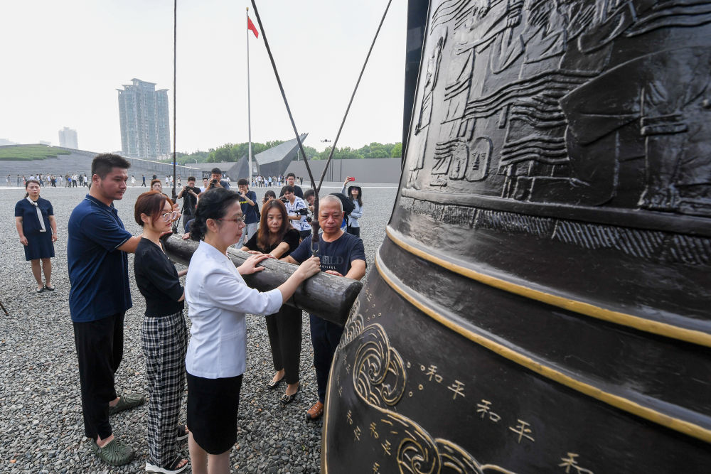 2023年8月15日,南京大屠殺幸存者后代代表在侵華日軍南京大屠殺遇難同胞紀(jì)念館公祭廣場(chǎng)撞響和平大鐘,祈福和平。