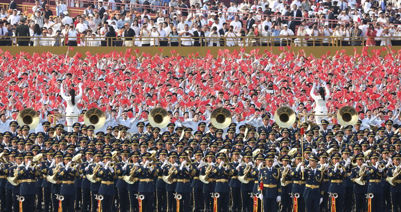 紀(jì)念大會開始前,天安門廣場上,千人聯(lián)合軍樂團(tuán)演奏四首歌曲,合唱團(tuán)唱響《松花江上》《在太行山上》《保衛(wèi)黃河》《沒有共產(chǎn)黨就沒有新中國》。