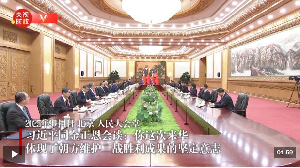 9月4日晚,中共中央總書記、國家主席習(xí)近平在北京人民大會堂同來華出席紀(jì)念中國人民抗日戰(zhàn)爭暨世界反法西斯戰(zhàn)爭勝利80周年活動的朝鮮勞動黨總書記、國務(wù)委員長金正恩舉行會談。