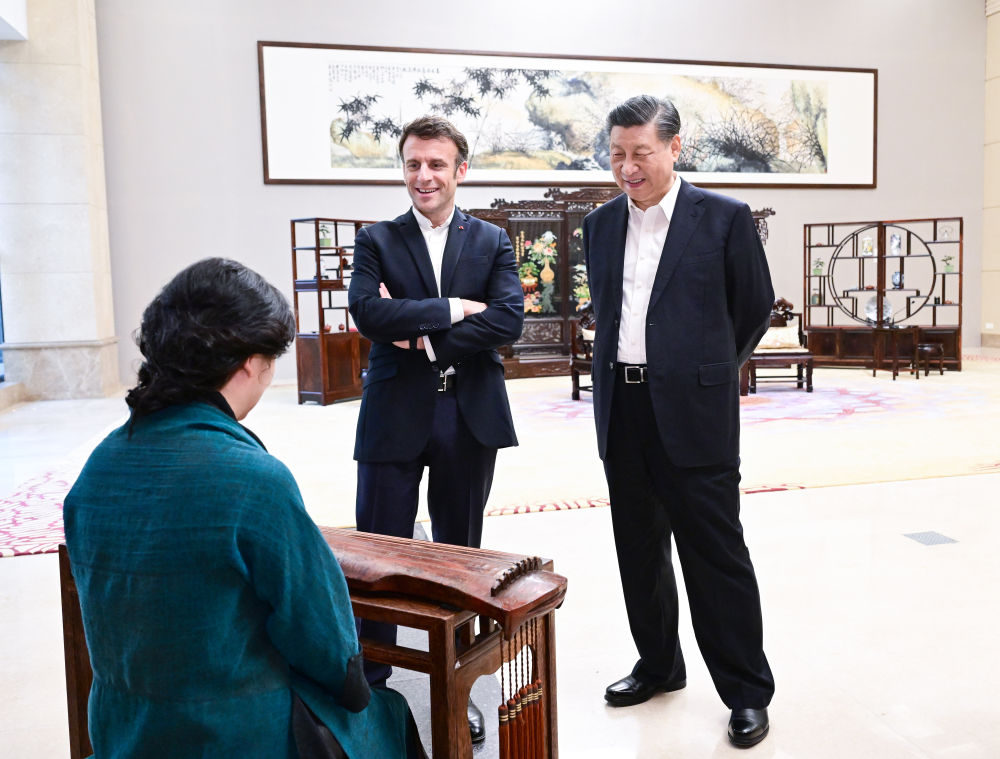 2023年4月7日,國家主席習近平在廣東省廣州市松園同法國總統(tǒng)馬克龍舉行非正式會晤。這是兩國元首在白云廳欣賞古琴演奏。新華社記者 岳月偉 攝