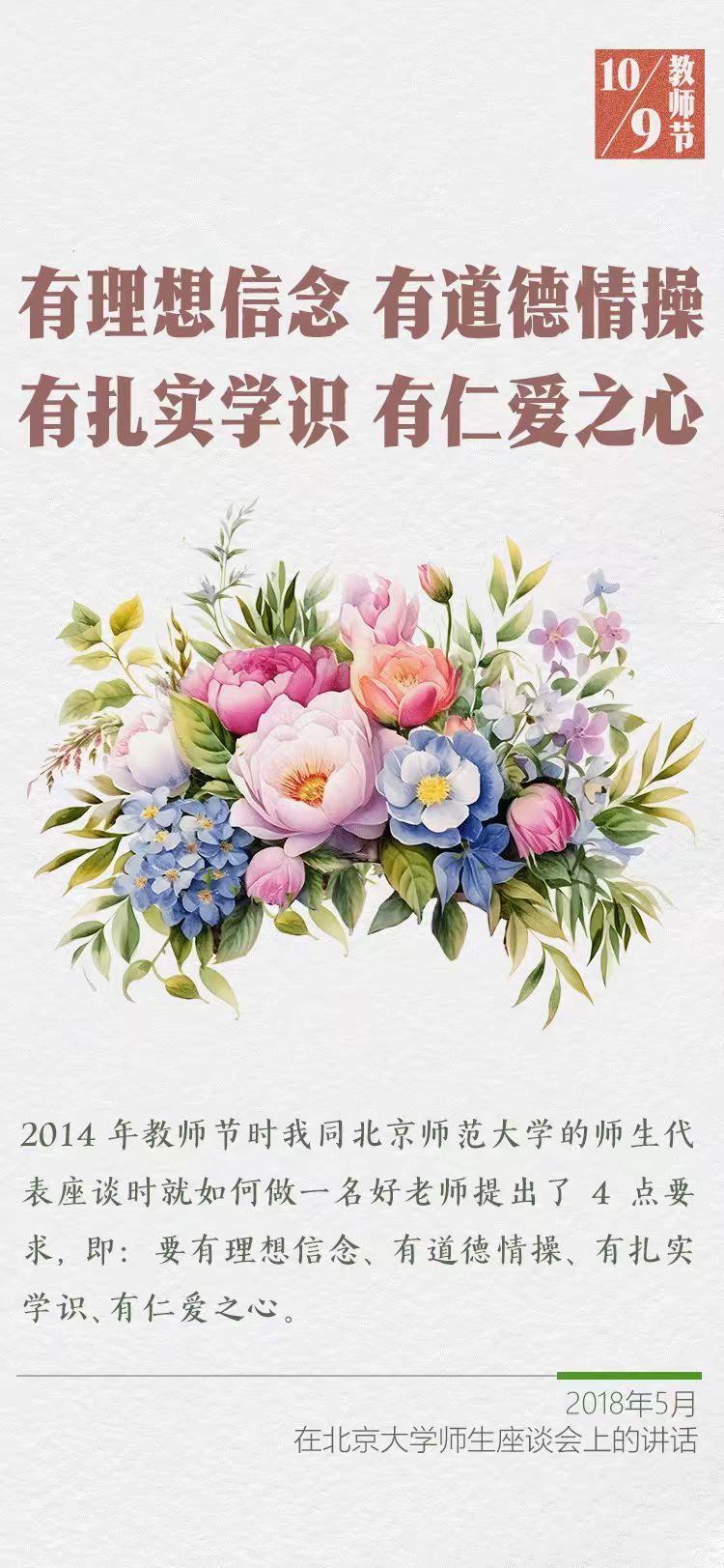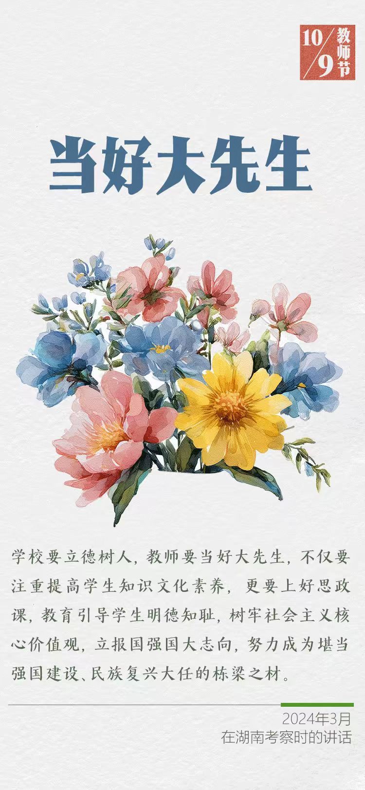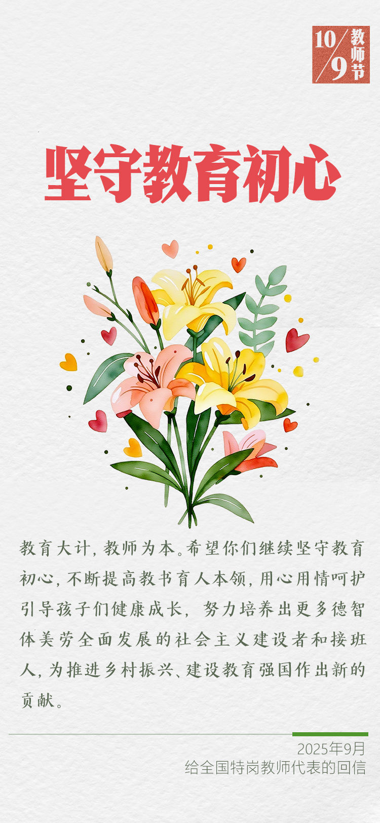 在第四十一個教師節(jié)到來之際,習近平總書記給全國特崗教師代表回信,提出殷切希望,并向全國廣大教師和教育工作者致以節(jié)日祝賀和誠摯問候。