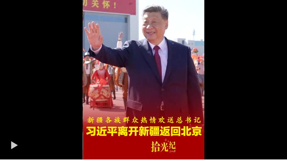 25日,習(xí)近平乘專(zhuān)機(jī)返回北京。烏魯木齊天山機(jī)場(chǎng)奏響別具特色的樂(lè)曲《我們?cè)谝黄稹罚髯迦罕娸d歌載舞熱情歡送總書(shū)記。