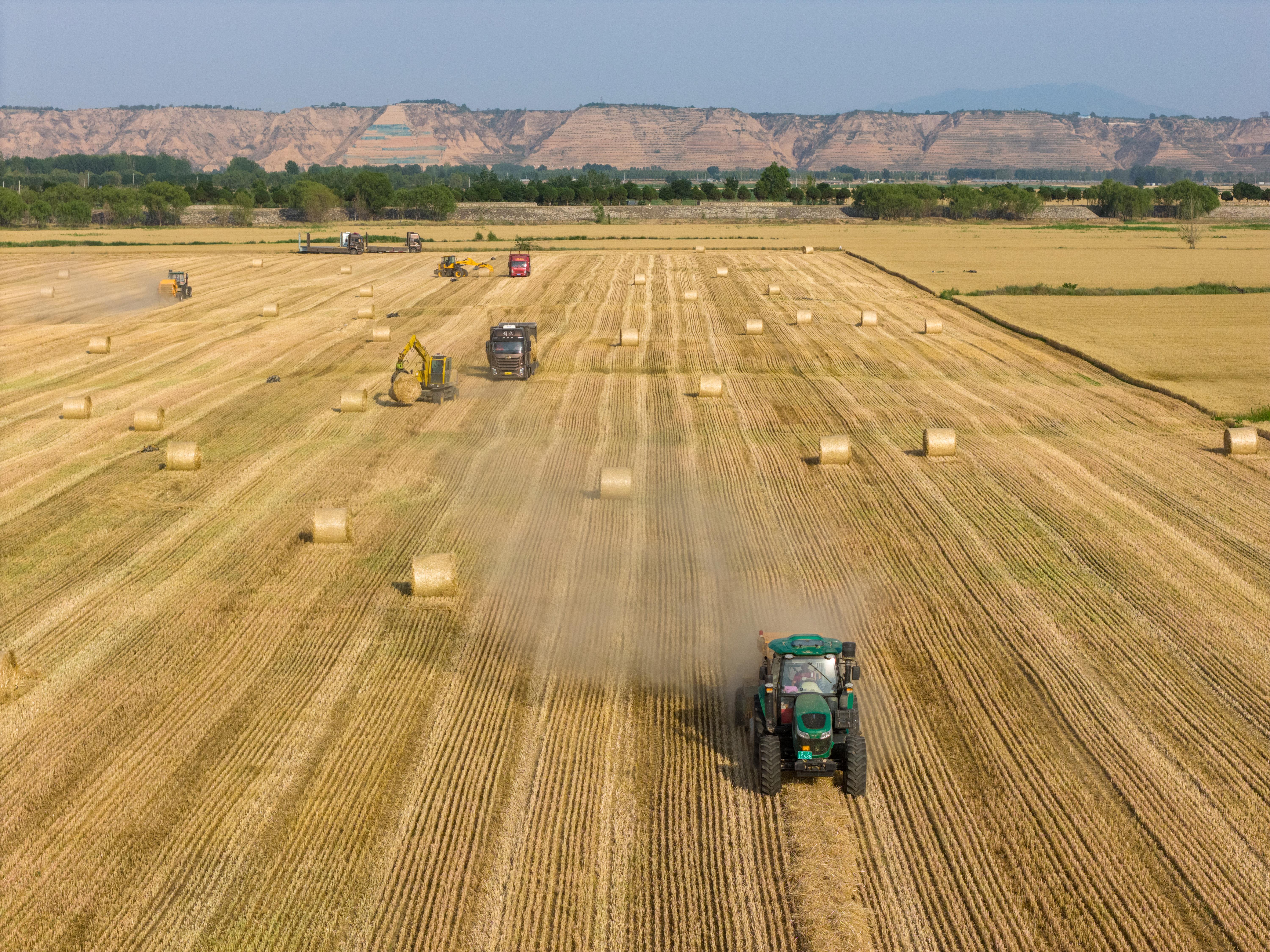 △據(jù)國家統(tǒng)計(jì)局發(fā)布的數(shù)據(jù),2025年全國夏糧總產(chǎn)量14973.8萬噸,實(shí)現(xiàn)穩(wěn)產(chǎn)豐收。圖為今年6月,山西運(yùn)城裴莊鎮(zhèn)黃河灘涂上,農(nóng)機(jī)手忙著實(shí)施小麥秸稈打捆和裝車運(yùn)輸作業(yè)。