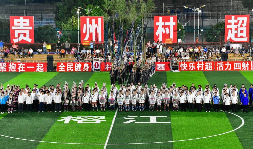 2025年8月23日,村民們在貴州“村超”球場演唱侗族大歌。當(dāng)日,2025年首屆“村超”全國賽總決賽在貴州榕江縣“村超”球場舉行。賽事期間同時(shí)舉辦豐富多彩的民族歌舞展演、無人機(jī)表演、大型煙花秀,吸引數(shù)萬觀眾現(xiàn)場觀賽。近年來,貴州“村超”“村BA”等草根賽事持續(xù)升溫,巧妙融合體育競技、民族文化與文旅消費(fèi),打造“體育+”模式,撬動(dòng)鄉(xiāng)村流量與經(jīng)濟(jì)增量,賦能鄉(xiāng)村振興。