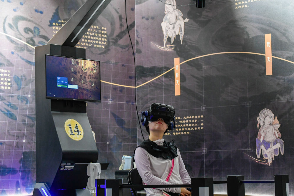 2024年7月22日,游客在“尋境敦煌——數(shù)字敦煌沉浸展”借助VR設(shè)備沉浸式游覽莫高窟第285窟虛擬場景?!皩ぞ扯鼗汀獢?shù)字敦煌沉浸展”綜合運(yùn)用VR虛擬現(xiàn)實(shí)、三維建模、游戲引擎的物理渲染和全局動(dòng)態(tài)光照等新技術(shù),高精度立體還原了莫高窟第285窟。游客戴上VR眼鏡,不僅可以零距離觀賞壁畫、360度自由探索洞窟細(xì)節(jié),還能“飛升”到窟頂,身臨其境參與壁畫故事情節(jié),沉浸式感受敦煌文化的魅力。