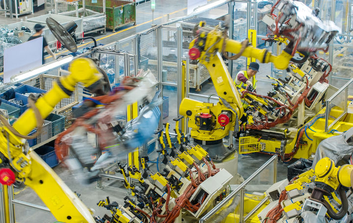 2025年10月9日,浙江省湖州市長興經濟技術開發(fā)區(qū)一家汽車部件有限公司的技術人員操控工業(yè)機器人生產新能源汽車配件(無人機照片)。新華社發(fā)(譚云俸攝)