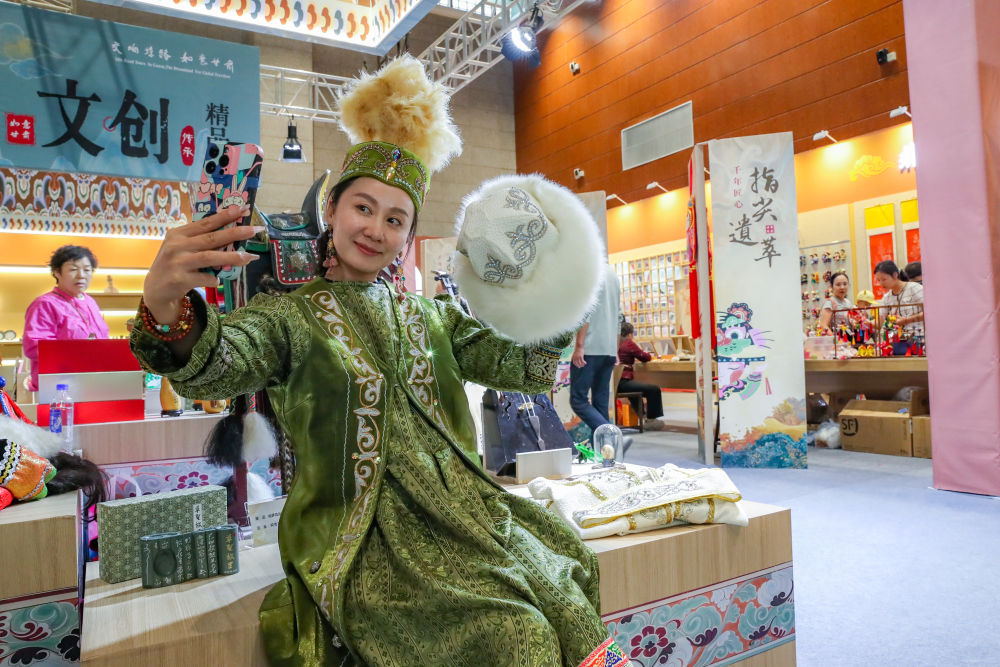 2025年9月22日,游客在敦煌文博會(huì)上身穿民族服飾自拍。9月20日至22日,第八屆絲綢之路(敦煌)國際文化博覽會(huì)在敦煌市舉行。敦煌研究院“典范”“高地”建設(shè)成果展、甘肅文旅非遺文創(chuàng)展、敦煌·絲路雕塑展等多項(xiàng)展覽同步亮相,集中展現(xiàn)了敦煌文化遺產(chǎn)保護(hù)、研究、弘揚(yáng)的最新成果以及共建“一帶一路”國家的文化藝術(shù)、非遺文創(chuàng)、風(fēng)土人情等精彩內(nèi)容。